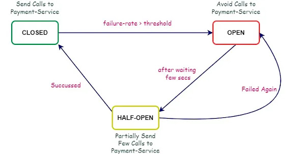 Half-Open-State: In this state, the circuit is partially closed. This means we send only a few n (n«N) requests and check the failure rate. If it still fails we move back to Open-State or go to Closed-State.