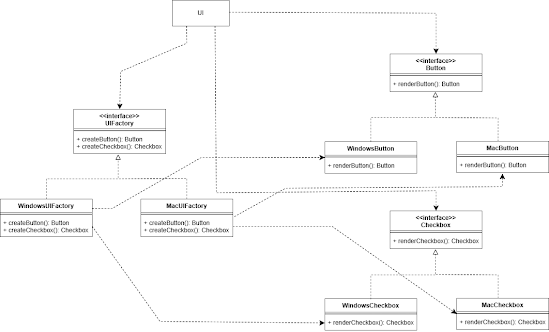 In this example, we look into UI building logic. Let’s say we want to create Buttons and Checkboxes for Windows and Mac. So, the objects are as follows: