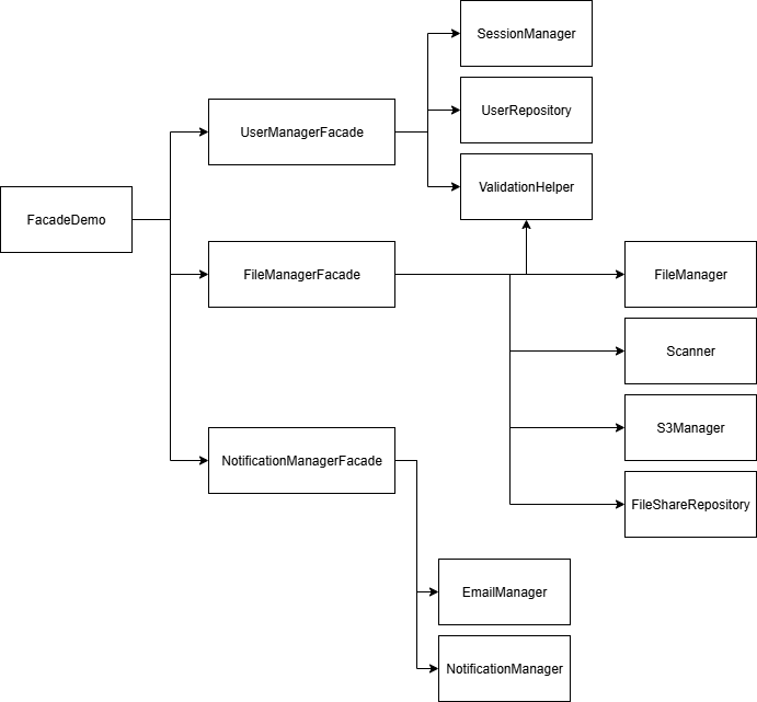 As we can see, the client classes do not need to worry about the underlying logic of UserManagerFacade, NotificationManagerFacade, FileManagerFacade. Since the coupling between classes is loose and each class is responsible for only a specific scope (separation of concerns), it becomes easy to maintain and test. This also improves the readability of the code.